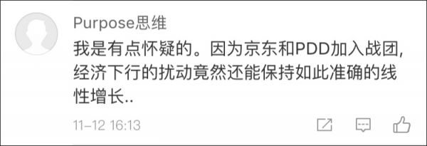 也有网友表示怀疑,在京东和拼多多加入战团的情况下,还能保持如此准确的线性增长值得怀疑。