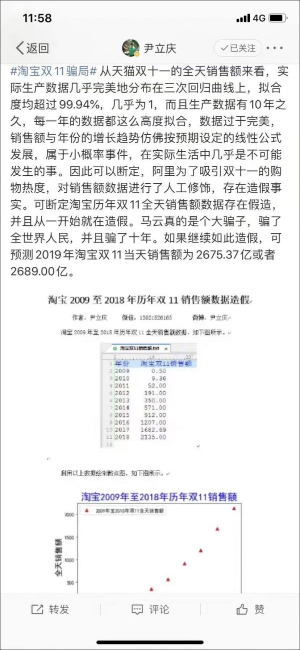 该观点由此判断,历年双十一的销售数据存在造假,并且从一开始就在造假,甚至直呼“马云是个大骗子”。