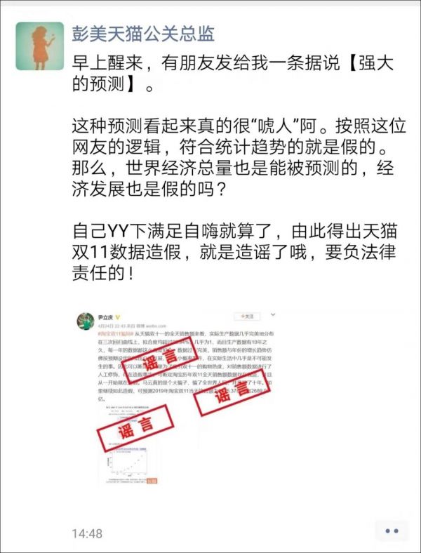 对此,天猫公关总监彭美在朋友圈称这种预测看起来很“唬人”。她反问,“按照这位网友的逻辑,符合统计趋势的就是假的,那么世界经济总量也是能被预测的,经济发展也是假的吗”?