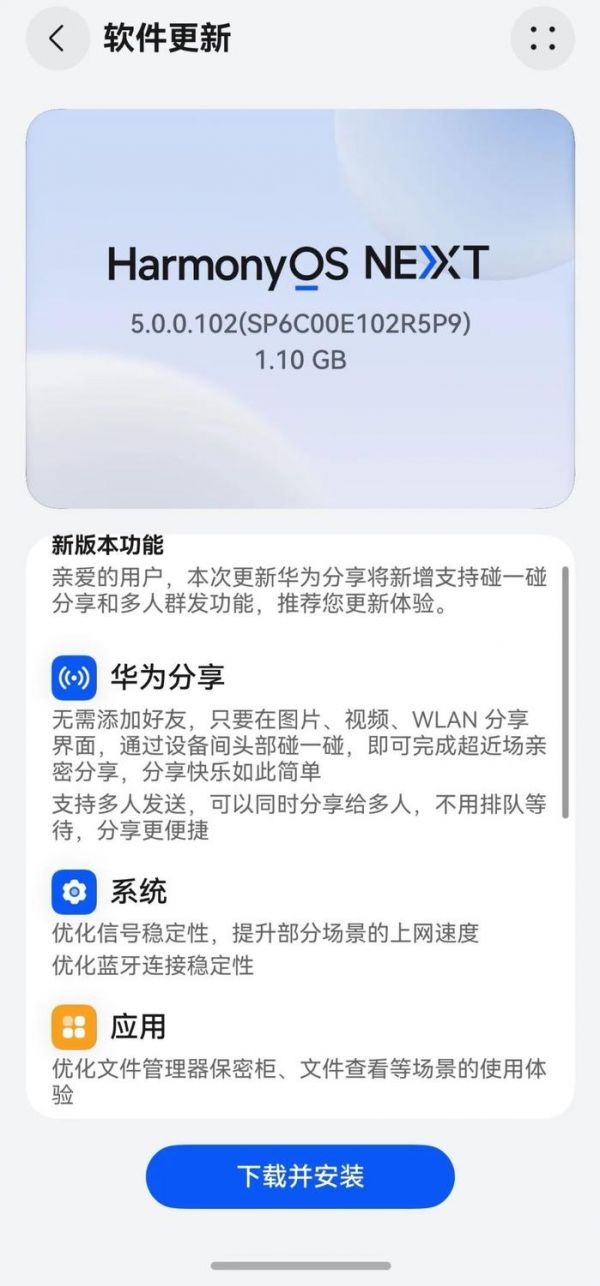 鸿蒙NEXT于上个月开始公测, 目前华为Mate 60系列、Mate X5、Pura 70系列等机型均在公测中,现据最新消息,近日鸿蒙NEXT推送了5.0.0.102新版本,碰一碰分享已上线。
