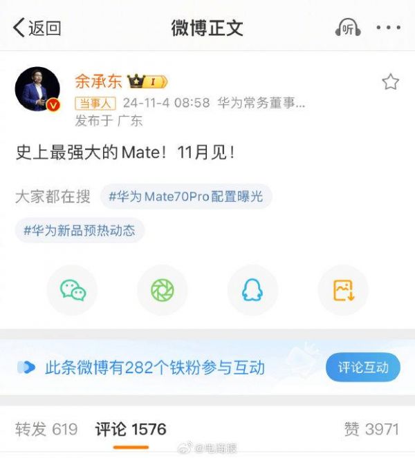 #华为Mate70定档11月# 余承东官宣,史上最强大的Mate 本月见!