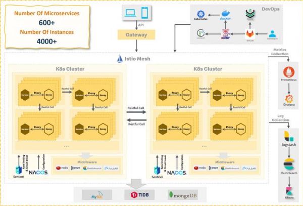 为了应对这一挑战,IT 团队参考 CNCF 的技术蓝图,选择了云原生技术路径,将微服务容器化,边车化,可观测,易于编排及管理,并且在此基础上构建了混合云架构。具体而言,就是将最核心的数据、最底层的服务以及中后台的服务放到 IDC(数据中心)上,另外将一些对于流量弹性有极致要求的服务部署在多朵云上,以此来满足业务需求。