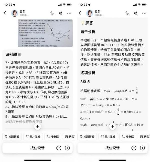 使用豆包拍照识别并解答高中物理题,AI 首先识别题目,再分析题干,最后进行逐项分析,体验非常好。