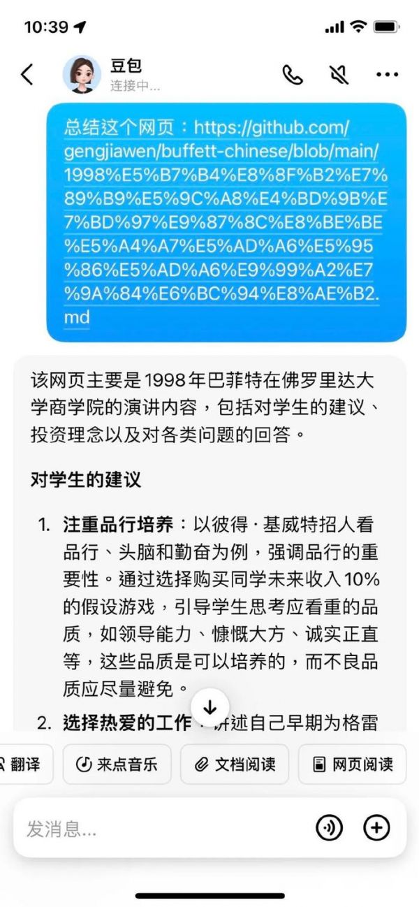 我们让豆包阅读并总结网页内容《1998 巴菲特在佛罗里达大学商学院的演讲》,结果如图。AI 总结得比较全面,它能胜任阅读冗长内容的工作。