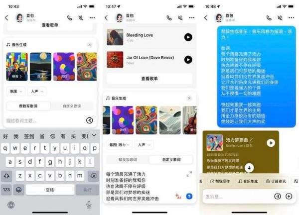 豆包会提供音乐生成模板,你也可以选择流行、摇滚、民谣、国风等大风格进行创作。选定风格后,可设定氛围和人声;歌词可以让 AI 自行生成,也可以添加描述。音乐生成后支持在线分享或以视频形式转存至本地,视频形式类似音乐串流应用的带歌词播放界面。