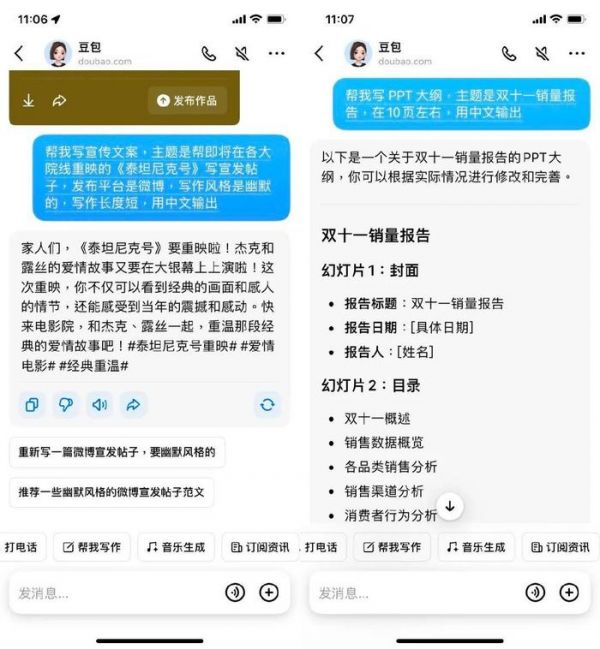 我们尝试让豆包写宣传文案和 PPT 大纲,它完成的都还不错。