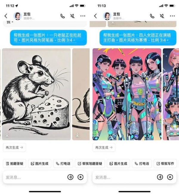 图片生成环节有许多模板可选,可以调整比例并添加特征词。我们尝试让豆包生成简笔画和赛博风格图片,结果总体令人满意。顺带一提,在豆包上生成 AI 图片一次性生成 4 张,且无需消耗任何代币,这一点优于我们尝试过的其他 AI 工具。