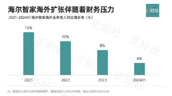值得注意的是,海尔智家海外基本盘的不断扩张,同样伴随着越来越大的财务压力。数据显示,2021年至2023年,海尔智家海外业务收入同比分别增长13%、10.3%、7.6%,成长性日趋减弱。到了2024年上半年,同比增长率进一步降到3.7%。