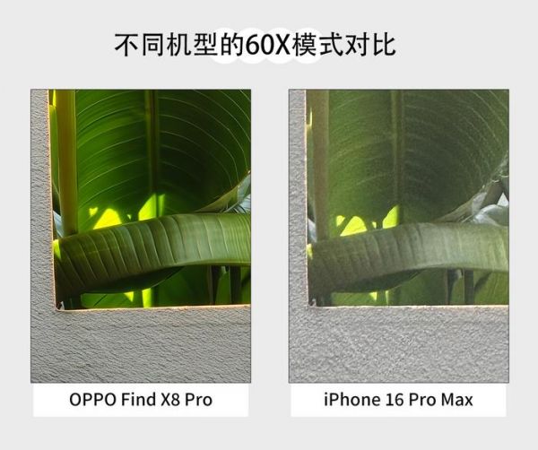 OPPO Find X8 Pro的6倍潜望长焦是2024年最长的原生焦段,配合上AI千里长焦,软硬结合带来了超强的望远能力。比如以下的60倍变焦样张就充分展示了它的实力,拍出来的墙面、叶子都非常清晰,甚至叶子上的纹理都能看清。iPhone 16 Pro Max最大的变焦倍数只有25倍,但为了公平,我们将样张放大到和OPPO Find X8 Pro的画面差不多,最终可以看到样张出现了明显的噪点和模糊感,远不及OPPO Find X8 Pro清晰。