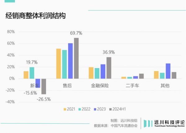 以2022年为例,国内经销商整体利润总和中,新车销售占比19.7%,略高于金融保险,低于售后的49%。2023年后,新车业务的贡献转为负值,足见价格战烈度。
