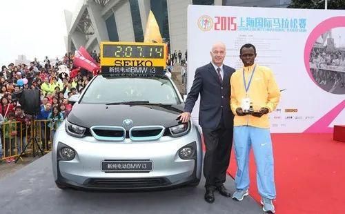 安格(左)出席2015年上海马拉松现场颁奖仪式