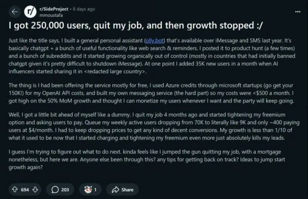 https://www.reddit.com/r/SideProject/comments/1gds937/i_got_250000_users_quit_my_job_and_then_growth/