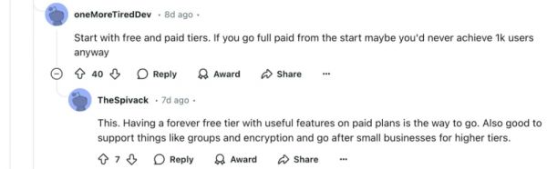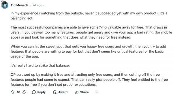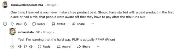 有网友说:“永远不要让免费产品付费。一开始就应该推出付费产品,或者进行试用,让人们知道试用期结束后必须付费。”作者表示十分赞同,并说道:“产品符合市场需求(Product / Market Fit,PMF)实际上应该是产品价格(Price)符合市场需求。”