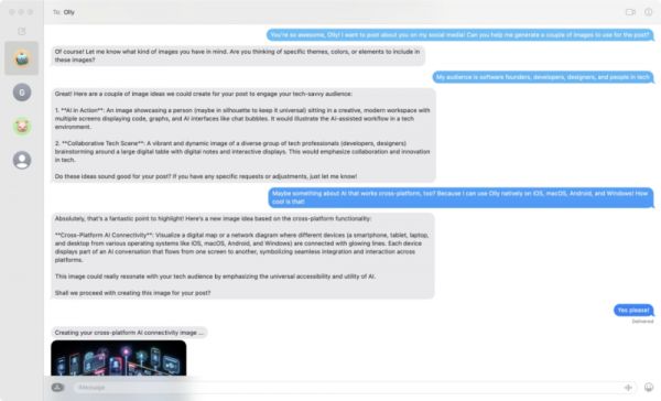olly.bot 精准击中用户们的痛点,应用集成在 iMessage 和 WhatsApp 中,这意味着你可以在 iOS、macOS、Android 和 Windows 上本地使用它。具体来说,它可以查看图片、阅读 PDF、收听语音备忘录、生成图片、浏览网页等,随着开发的持续,能力还在不断增多。