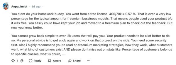 一位网友指出:“作者的应用程序每周活跃用户 7 万,每月 4 美元的付费用户只有 400 人左右,400/70k ≈ 0.57%,对于免费增值业务模式来说,这个百分比都非常低。这意味着人们使用该产品是因为它是免费的...... 我的个人建议是重新找一份工作,并在业余时间从事该项目。”