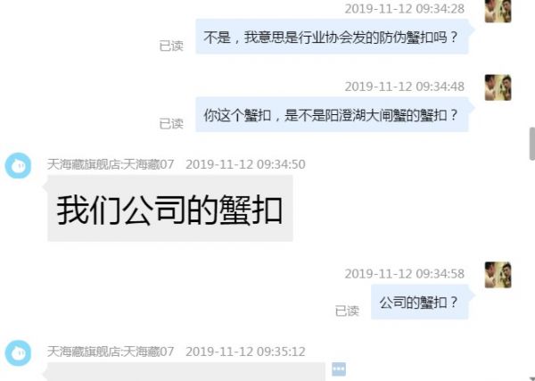 当被记者问及,是否具有蟹扣时,该客服表示是“有蟹扣的”。记者进一步追问其蟹扣是否为行业协会发放的防伪蟹扣时,对方承认“(蟹扣)是我们公司的蟹扣,不是阳澄湖的蟹扣。”