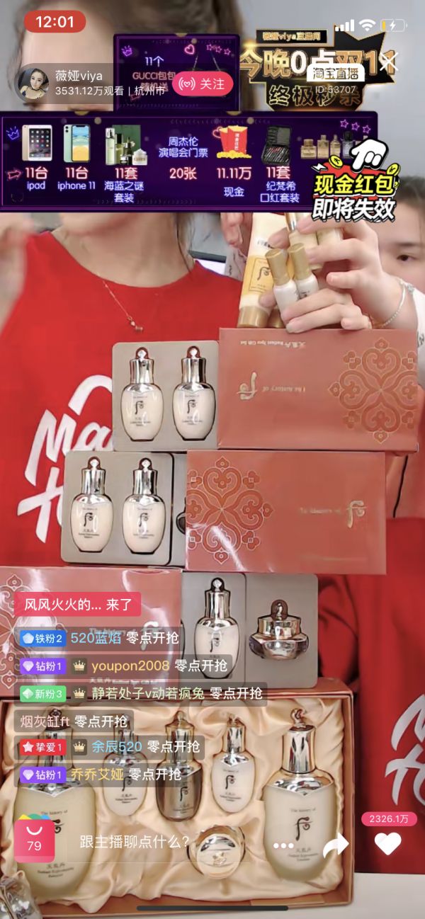 “双11”凌晨,时间刚过十二点。“热门领到券拍下1399元,送1套礼盒,送2套礼盒,送3套礼盒,送一个洗面奶再加一个卸妆膏,再送两个某产品小样、两个精华、一个隔离再加一个唇膏。”薇娅一边告诉直播屏幕前的粉丝,具体活动内容,一边将商品和她口述的所有赠品一个接着一个摆进了镜头前,直到她被商品“淹没”。