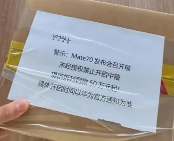 有网友留言称,从未有一款手机的关注度如此之高。据新浪科技11月5日消息,有网友晒图,Mate 70已经到达线下经销商那里,“Mate 70发布会召开前,未经授权禁止开启,提前拆封罚款50万元起。”“华为Mate 70提前拆封罚款50万起”登上微博热搜。针对此事,华为官方暂无回应。