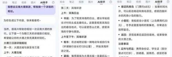 以百度APP内的AI搜索助手作为对比。当对两个AI搜索服务,分别输入“我想去云南大理旅游,帮我做一个详细的规划”的问题后,两款AI搜索产品都能在短时间内进行规划作答。