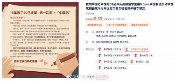 淘工厂数据显示,双 11 期间,这款产品已经成为热销款,单日能热销2000 支。在端内,淘工厂也给“中国芯”推到了厂牌专区的首页。#从内到外中国制造的中性笔单价不足2元#