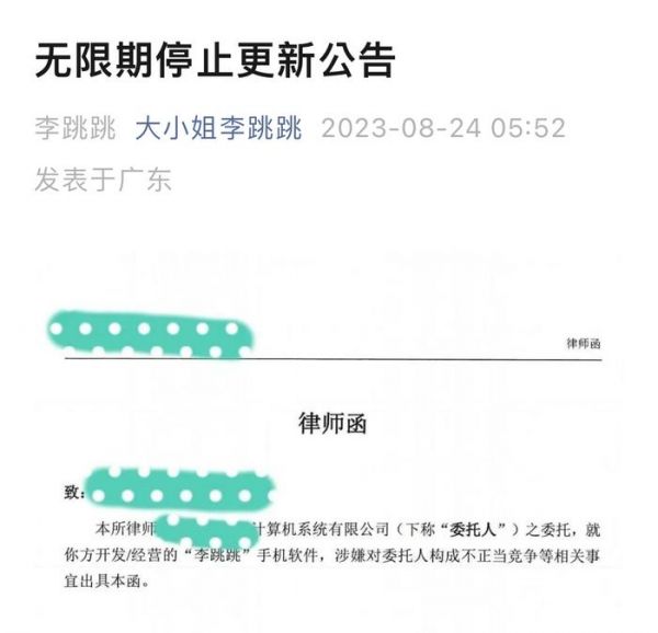 可惜,挡了互联网大厂财路的李跳跳,注定不会有好结局。2023年8月24日一大早,李跳跳官微发文表示,收到了某互联网大厂的律师函,称李跳跳涉嫌违反《中华人民共和国反不正当竞争法》第二条、第十二条第二款第四项的规定,构成不正当竞争,因而将无限期停止李跳跳更新。