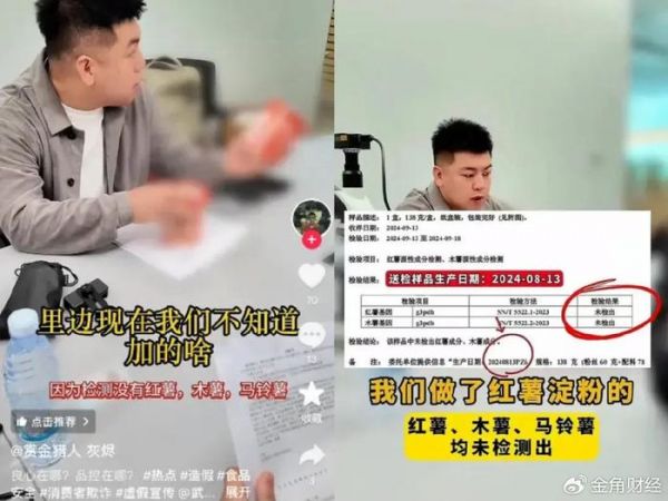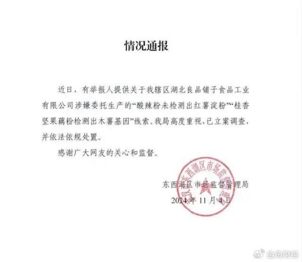 事件起始于11月3日,打假博主“松哥打虎”“赏金猎人灰烬”联合发布视频,称良品铺子的桂香坚果藕粉检测出了木薯基因,而酸辣粉未检测出红薯淀粉,质疑良品铺子配料表造假。