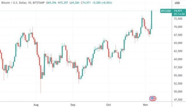 截至发稿,比特币日内暴拉5600美元,一举创下7.5万美元的历史新高。