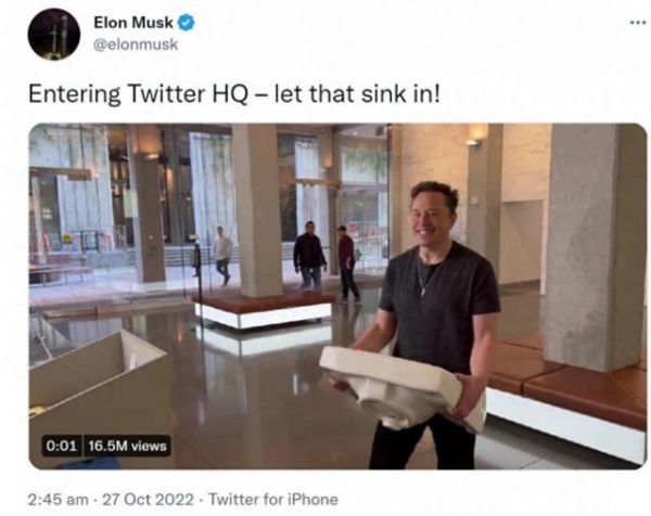 (马斯克收购推特时的同款“水槽”再度出镜,来源:X)