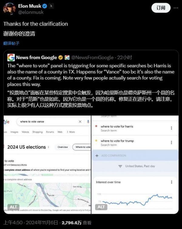 很不巧的是,谷歌还在大选日卷入了争议。有网友发现,搜索“哪里能为哈里斯投票”时,会跳出一个显示“投票地点”的地图;但搜索“哪里能为特朗普投票”时,就没有这个功能,引发了特朗普支持者的不满。
