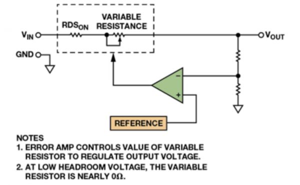 早期的LDO设计提供大约1.3 V的压差,这意味着对于5 V的输入电压,器件进行调节可实现的最大输出仅为3.7 V左右。然而,在当今更复杂的设计技术和晶圆制造工艺条件下,'低'大致定义为<100mV到300mV左右。