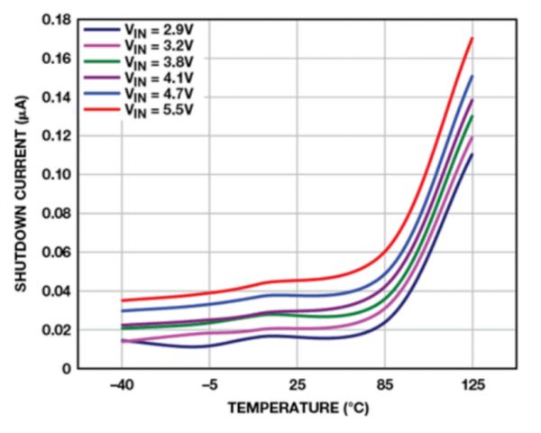 关断电流指输出禁用时LDO消耗的输入电流。参考电路和误差放大器在关断模式下都不上电。较高的漏电流会导致关断电流随温度升高而增加。