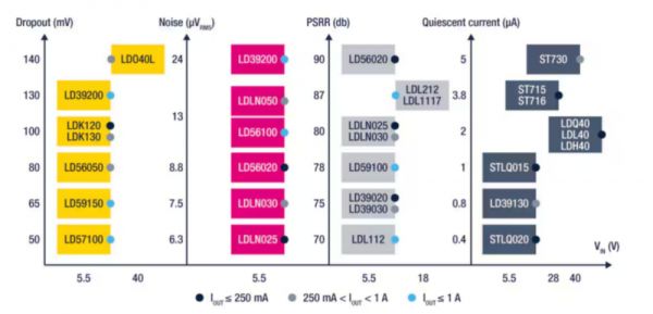 ST的LDO主要分为三个系列:高PSRR LDO稳压器、低Iq LDO稳压器、超低压差LDO稳压器。其产品特性为低压差、低静态电流(低IQ)、快速瞬态响应、低噪音、良好的纹波抑制。