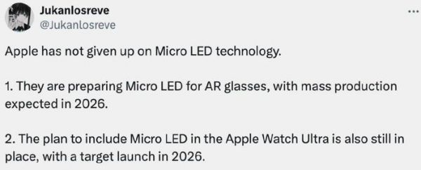 此前有爆料人表示,苹果预计将为AR眼镜搭载具有响应速度快、视角大、色彩表现力好、亮度高、寿命长等优势的Micro LED,并将在2026年开始量产。