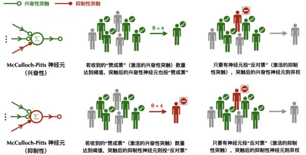 McCulloch-Pitts神经元的工作原理:兴奋性突触一人一票,抑制性突触一票否决。