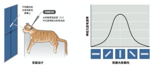 Hubel和Wiesel在麻醉后的猫眼前放一块屏幕,并往屏幕上投射不同朝向的光条。他们将有玻璃包裹的钨丝微电极插入猫的初级视皮层,记录神经元的电活动。他们发现当只有当光条转向特定角度时,“简单细胞”的放电最为强烈。