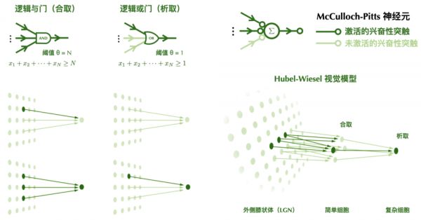 如果不考虑抑制性输入,高阈值的McCulloch-Pitts神经元相当于执行逻辑合取操作,当且仅当所有输入都为1时,输出为1,否则输出为0;低阈值的McCulloch-Pitts神经元相当于执行逻辑析取操作,当且仅当所有输入都为0时,输出为0,否则输出为1。不同阈值的McCulloch-Pitts神经元,可以用来解释视觉皮层中“简单细胞”和“复杂细胞”的行为。Hubel-Wiesel模型通过组合高阈值的“简单细胞”和低阈值的“复杂细胞”,实现了视觉系统的方向选择性和位置不变性。