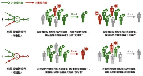 线性阈值神经元的工作原理:兴奋性的突触拥有正权重,抑制性突触拥有负权重,投票结果由加权和决定。