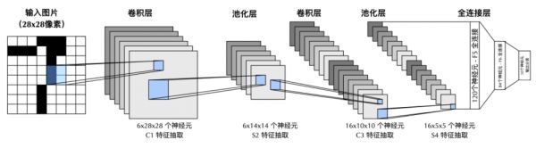 最经典卷积神经网络—LeNet-5的结构。该神经网络可以用于手写体数字识别,输入为28x28像素的图片,输出的10个神经元分别代表数字0-9中的一类。卷积层的神经元类似于Hubel-Wiesel模型中的“简单细胞”,用于实现视觉过程的选择性,池化层中的神经元类似Hubel-Wiesel模型中的“复杂细胞”,用于实现视觉过程的不变性。简单细胞和复杂细胞交替的层级结构,帮助神经网络提取关于视觉输入的高级特征。