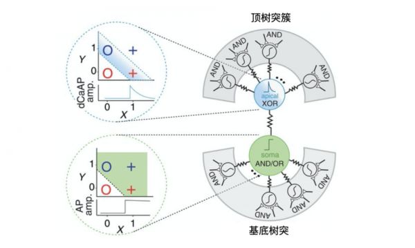 人类大脑皮层2/3层的锥体神经元的顶端树突可以进行类似异或的非线性运算,而胞体可以进行与/或等线性运算。