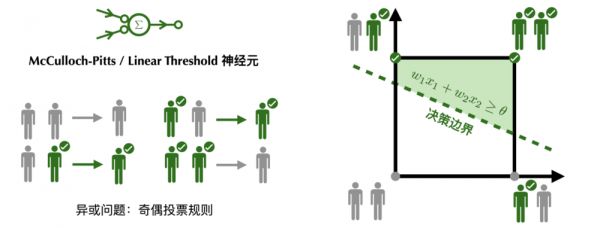 无论是McCulloch-Pitts神经元的民主规则,还是线性阈值神经元的民主,都无法实现奇偶投票规则。神经元的激活特性可以由决策边界刻画。只有线性可分的问题才可被单层神经网络计算。