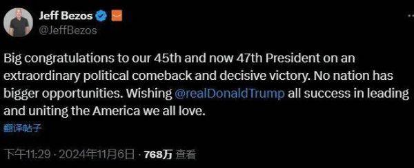 就在特朗普宣布胜利前,贝索斯就送上了热情的祝贺:“热烈祝贺我们的第45任和现在的第47任总统,取得了一场非凡的政治复出和决定性的胜利。”