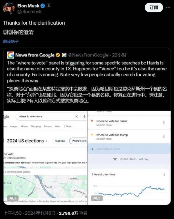 很不巧的是,谷歌还在大选日卷入了争议。有网友发现,搜索“哪里能为哈里斯投票”时,会跳出一个显示“投票地点”的地图;但搜索“哪里能为特朗普投票”时,就没有这个功能,这引发了特朗普支持者的不满。