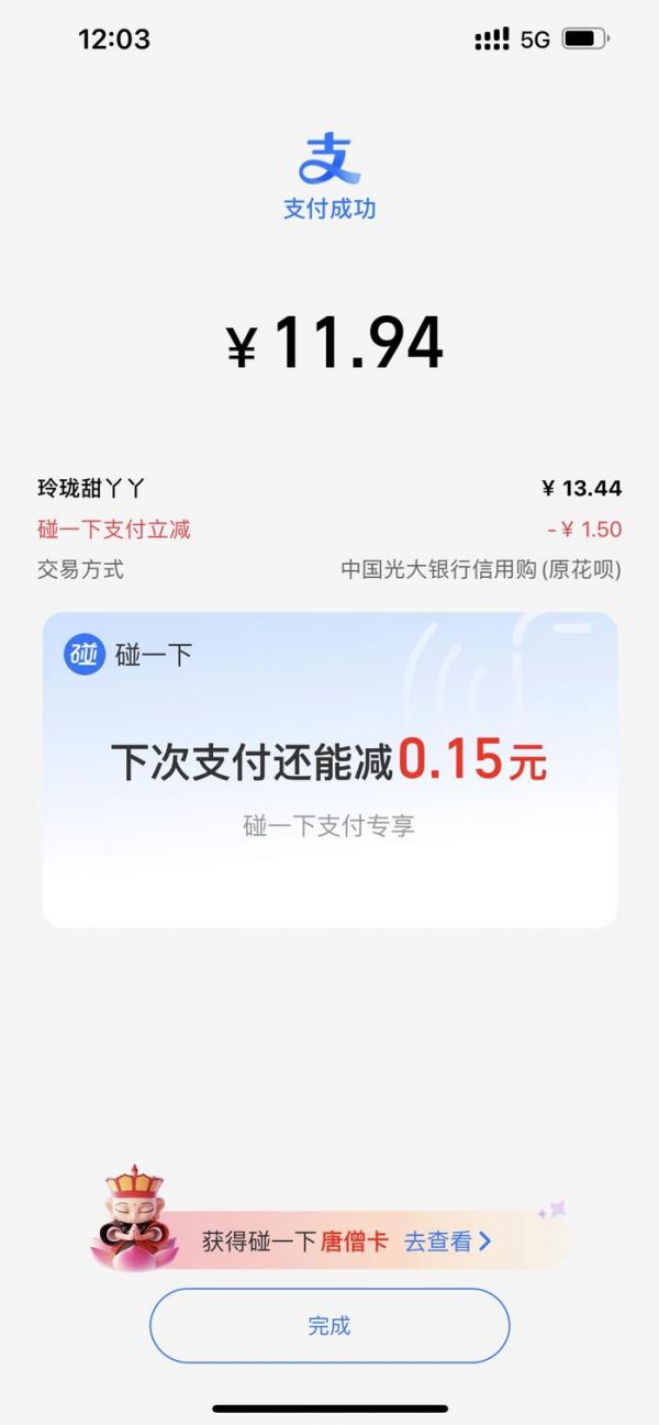 抱着“笔笔都能减”的薅羊毛心态,你拿着手机碰了下那个黑色的圈圈,“支付立减1.5元”便出现在了支付宝支付成功的页面。