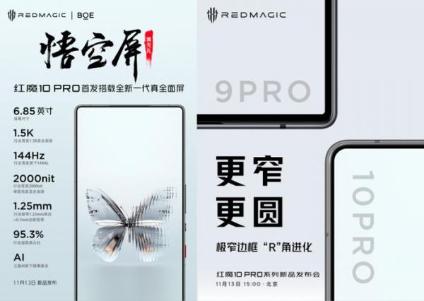 另外就是红魔这边,此前红魔预热将于11月13日15点在北京发布全新红魔10 Pro系列,首发搭载全新“悟空屏”:1.5K分辨率无打孔真全面屏、95.3%屏占比,今天官方公布了真机照,并介绍了屏幕的详细规格。