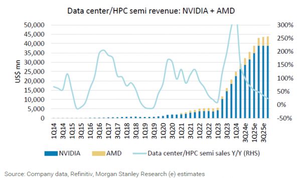 摩根士丹利甚至算了一笔账,预计2025年,美国主要科技巨头的各种AI投入,所有加起来合计有4000亿~4500亿美金(GPU、数据中心等等杂七杂八),这个支出数字已经超过阿波罗登月计划的总额。