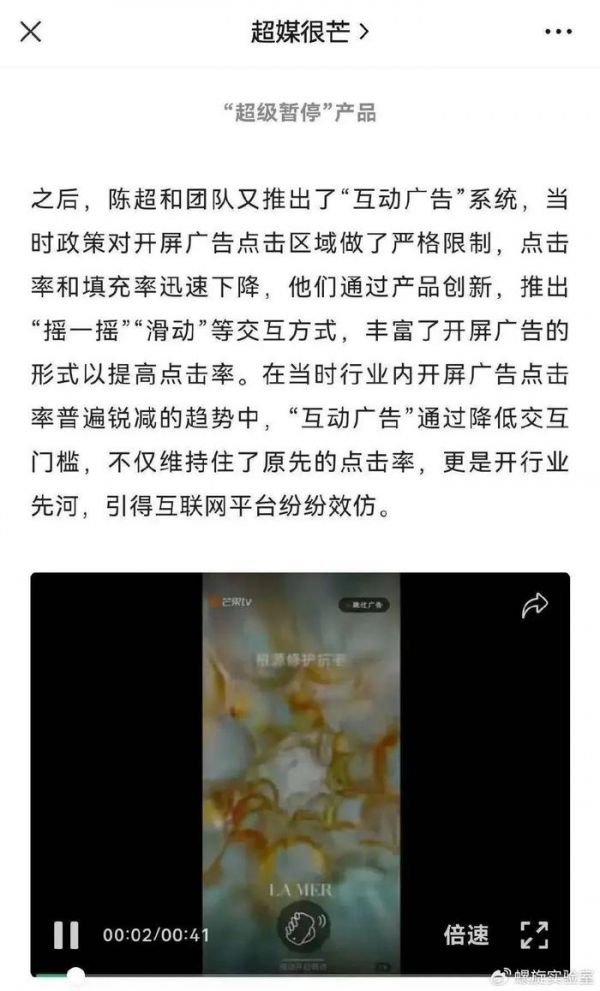 去年3月,名为“超媒很芒”的公众号发布了一篇颁奖文章,其中为一位运营员工颁发“2022年度金芒员工一等奖”,他获奖的理由是带领团队推出了“摇一摇”“滑动”等互动广告。