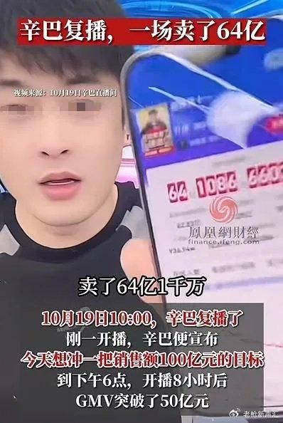 公开信息显示,这场直播共持续八个半小时,吸引了6900多万人次收看。截至当晚24点收官,辛巴对着镜头亮出了手机战报:一天下来,直播间的GMV达到了64.1086亿元。