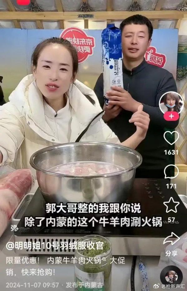 镜头前,主播扎着利落马尾,穿着羽绒服。一边熟练地翻煮锅里的呼伦贝尔羊肉,一边热情地与直播间的观众们聊家常互动。这是11月7日,在快手达人“明明姐10号羽绒服收官”直播间中出现的带货场景。