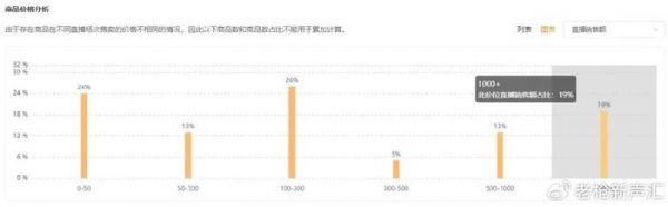 以上文中提到的达人主播@蕙质兰心为例,据飞瓜快数显示,其在当天的直播中,主打箱包饰品、家装建材、手机数码、厨卫家电类产品,客单价平均达到224元。但从商品价格分布来看,近五成商品的价格处在0-50元和100-300元两个价位中,300元以下商品在总销售额中的占比高达63%,1000元以上的高客单价商品在总销售额中的占比不足20%。