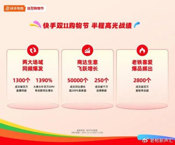 公开信息显示,10月12日至28日“双11”大促期间,快手电商内容场及泛货架场域迎来全域同频爆发,成交破百万直播间数量超1300个,成交同比增长超200%卖家数超5万个。大牌大补百万GMV单品数同比增长1390%,成交破千万品牌数超250个,成交超百万的超级单品数超2800个。其中,10月19日—20日17点,超1.6万位主播单场GMV超过去年双11峰值。